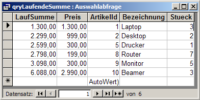 Nach ähnlichem Muster funktioniert die Berechnung von laufenden Summen in Abfragen. Folgender Ausdruck in einem berechneten Feld summiert die Preise in der Artikeltabelle zeilenweise auf: