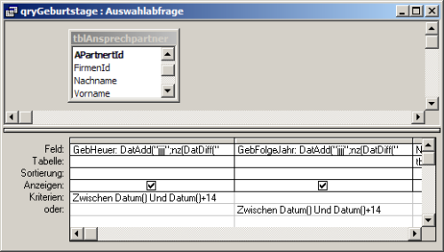 In der Beispiel-Datenbank gibt es die Abfrage qryGeburtstage, die aus den Geburtsdaten der Tabelle tblAnsprechpartner ermittelt, welcher Ansprechpartner in den nächsten 14 Tagen Geburtstag hat. In einem berechneten Feld GebHeute wird dazu das Geburtsdatum in das aktuelle Jahr transferiert. Der Ausdruck lautet: