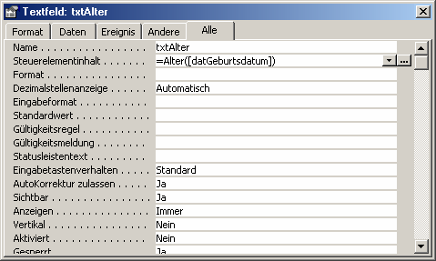 Dort wird als Wert für die Eigenschaft Steuerelementinhalt die entsprechende Funktion aufgerufen, der als Parameter der Inhalt des zu berechnenden Feldes übergeben wird (siehe Bild 9).