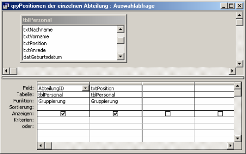 Bei der Verwendung von Gruppierungen in Abfragen ist es sinnvoll, nur die unbedingt notwendigen Felder zu gruppieren. Dadurch wird die Ausführungsgeschwindigkeit der Abfrage optimiert.
