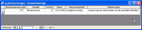 Falls ja, wird ein entsprechender Umbuchungsdatensatz in den Tabellen tblUmbuchungen und tblBestandsaenderungen angelegt (siehe Bild 3). Von dem Vorgang sind zwei Tabellen betroffen, weil es mehrere Ausprägungen einer Bestandsveränderung gibt – Eingänge, Ausgänge und Umbuchungen. Alle haben spezielle Eigenschaften, die jeweils in unterschiedlichen Tabellen gespeichert und mit der Tabelle tblBestandsaenderungen per 1:1-Beziehung verbunden werden. Weitere Informationen zum Datenmodell und zu dieser Vorgehensweise finden Sie im ersten Teil dieser Beitragsreihe in Ausgabe 2/2005.