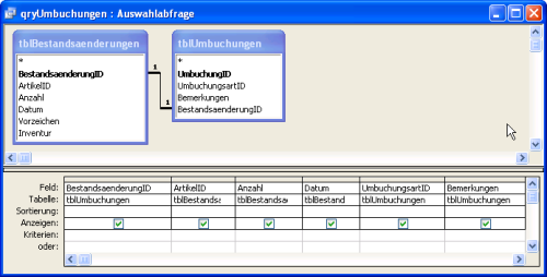 Die UNION-Abfrage namens qryBestandsaenderungen fasst die drei Abfragen qryUmbuchungen, qryWareneingang und qryWarenausgang zusammen und fügt ein weiteres Feld namens Bestandsaenderungsart hinzu, das einen der drei Werte Umbuchung, Wareneingang oder Warenausgang annehmen kann.