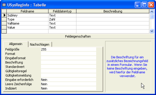 Bild 6: Entwurfsansicht der Tabelle USysRegInfo