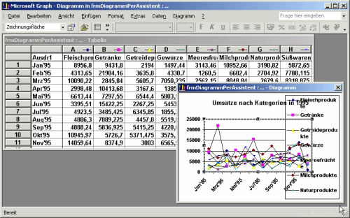 Mit dem Assistenten haben Sie dem Formular ein Steuerelement mit einem Diagramm hinzugefügt. Um es zu bearbeiten, verfahren Sie mit anderen Steuerelementen, die via OLE in einem Access-Formular untergebracht werden, folgendermaßen: öffnen Sie das Formular in der Entwurfsansicht und klicken Sie auf das Steuerelement.