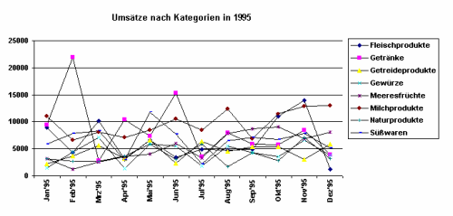 Mit dem Liniendiagramm können Sie den Verlauf der unterschiedlichen Kategorien durch die farbige Unterscheidung gut darstellen.