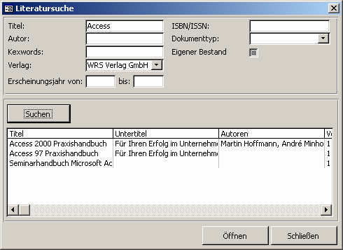 Die Prozedur prüft zunächst, ob im Suchfeld ein Suchtext eingegeben wurde. Die NZ-Funktion testet dabei den Wert Null und Leerzeichenketten ab. Wenn ein Suchtext eingegeben ist, wird der Datenbestand des Formulars in die Variable rstLiteratursuche vom Typ Recordset kopiert. Anschließend führt die Prozedur eine Like-Suche mit der Methode FindFirst durch und ermittelt den ersten Datensatz, der dem Suchkriterium entspricht. über die Bookmark-Eigenschaft des Formulars wird schließlich auf den Datensatz positioniert.