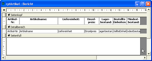 Erstellen Sie zunächst einen Bericht, dessen Entwurfsansicht wie in Bild 2 aussieht. Der Bericht selbst enthält noch kein einziges grafisches Element wie eine Linie über- oder unterhalb des Detailbereichs. Sämtliche Linien, die in der Druckansicht des Berichts wie in Bild 3 zu erkennen sind, werden per VBA-Code erstellt.