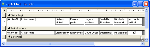 Einen Unterbericht, der auf jeder Seite die Spaltenüberschriften ausgibt, wäre der aus Bild 1. Der Bereich Seitenkopf wird auf der ersten Seite angezeigt und auf jeder folgenden Seite des Berichts wiederholt (siehe Bild 2).