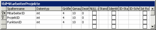 Diese Tabelle dient der Verknüpfung von Mitarbeitern und Projekten. Der Hintergrund ist, dass es durchaus vorkommen kann, dass nicht nur einer, sondern mehrere Mitarbeiter an einem Projekt arbeiten. Außerdem ist auch der Fall vorstellbar, dass ein Mitarbeiter mehrere Projekte gleichzeitig bearbeitet. Mit der Tabelle tblMitarbeiterProjekte kann man jedem Projekt jeden Mitarbeiter zuweisen.