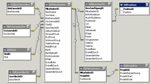 Kernstück des Datenmodells ist die Tabelle tblMitarbeiter. In dieser Tabelle werden die Daten der Mitarbeiter wie Name, Anschrift, Geburtsdaten usw. behandelt, die unmittelbar mit der jeweiligen Person im Zusammenhang stehen.