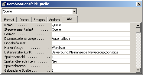 Abb. 10 Das Eigenschaftsfenster der Kombinationsfelds Quelle