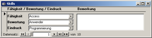 Diese Musterlösung zu einer Skill-Verwaltung finden Sie auf der beiliegenden CD-ROM für Access 97 (Skills97.mdb) und Access 2000 (Skills2000.mdb).