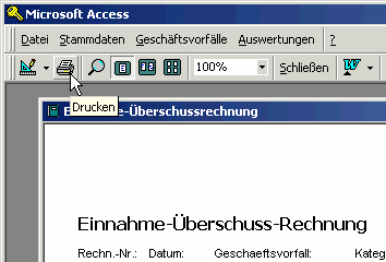 Das Ausdrucken erfolgt zentral über die Menü- bzw. Symbolleiste. Beim öffnen eines Berichts sind sowohl im Menü Datei als auch auf der entsprechenden Symbolleiste (siehe Bild 2) Schaltflächen zum Drucken des aktuell angezeigten Objekts vorhanden.